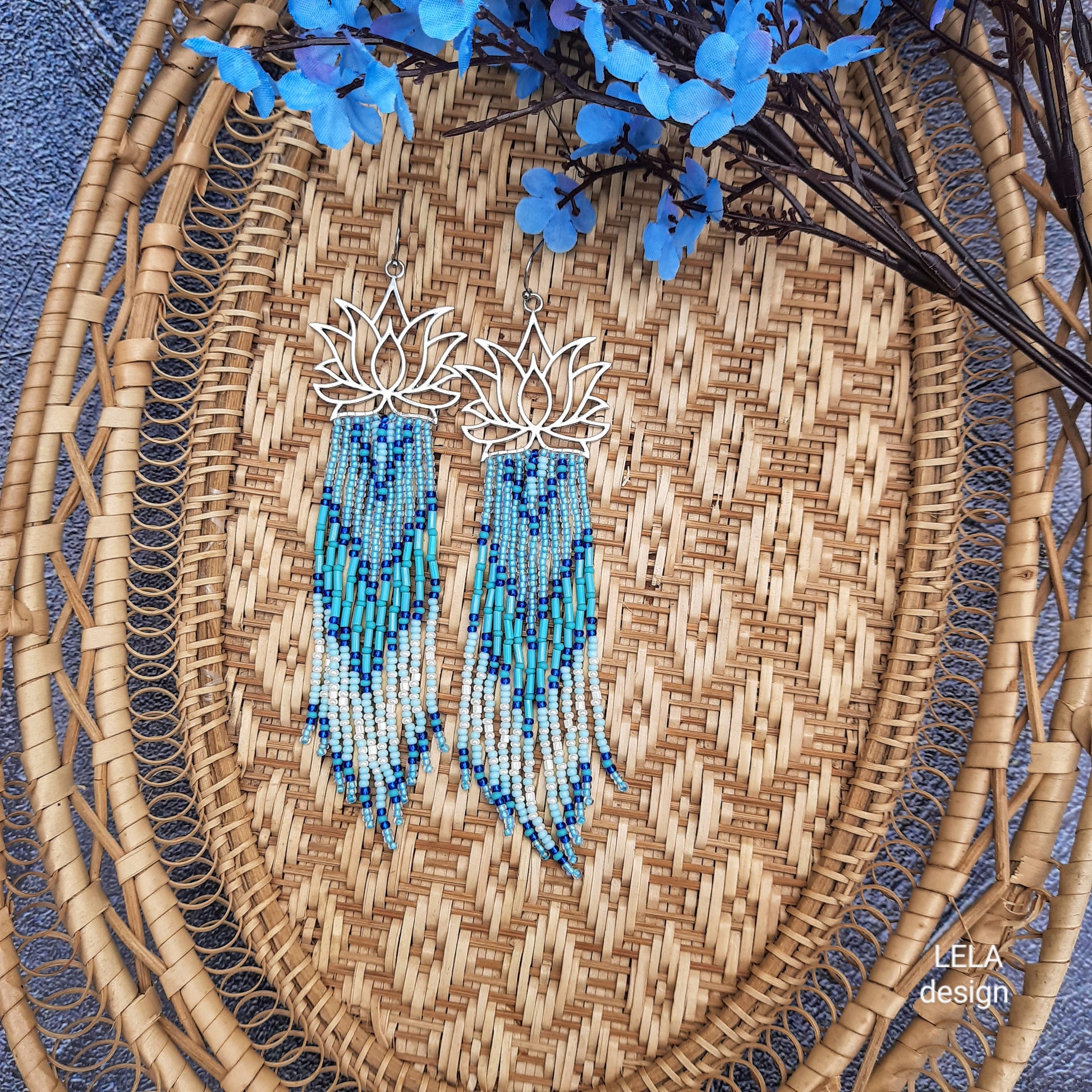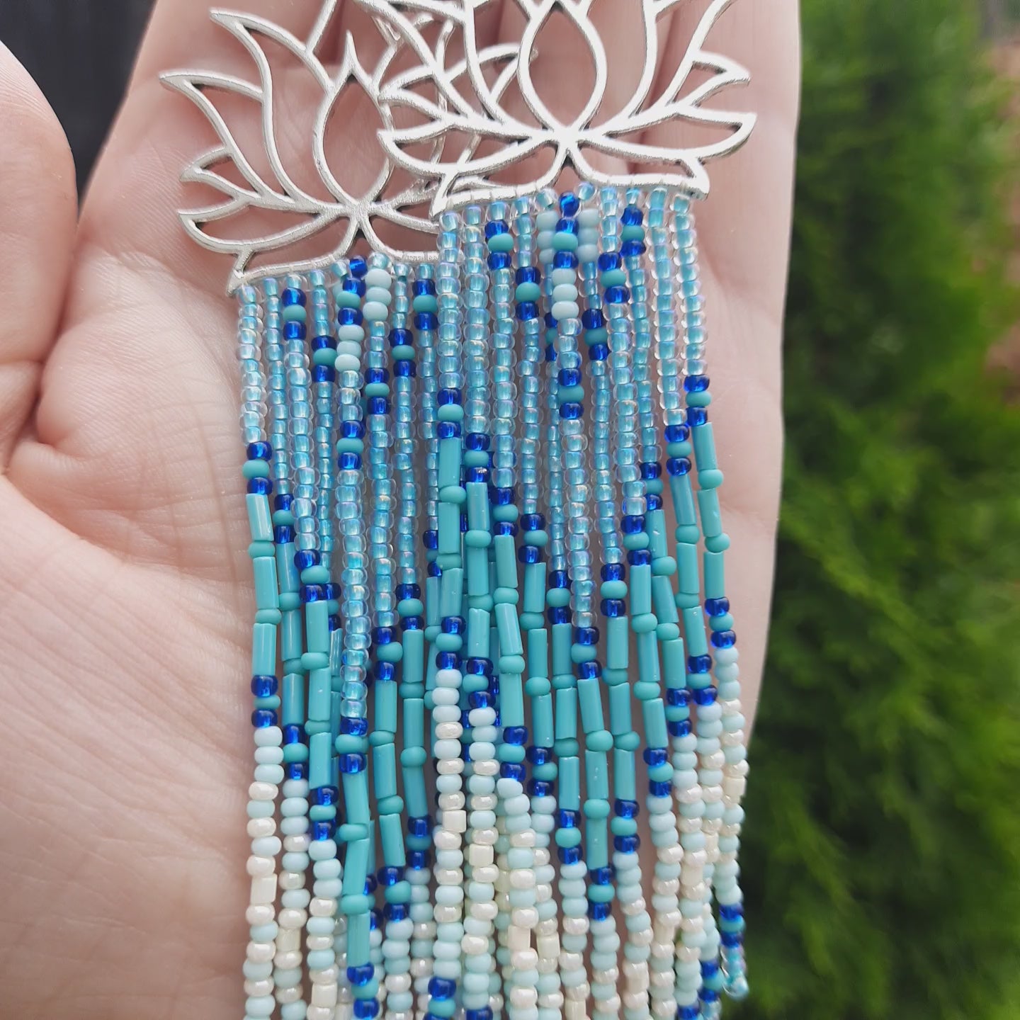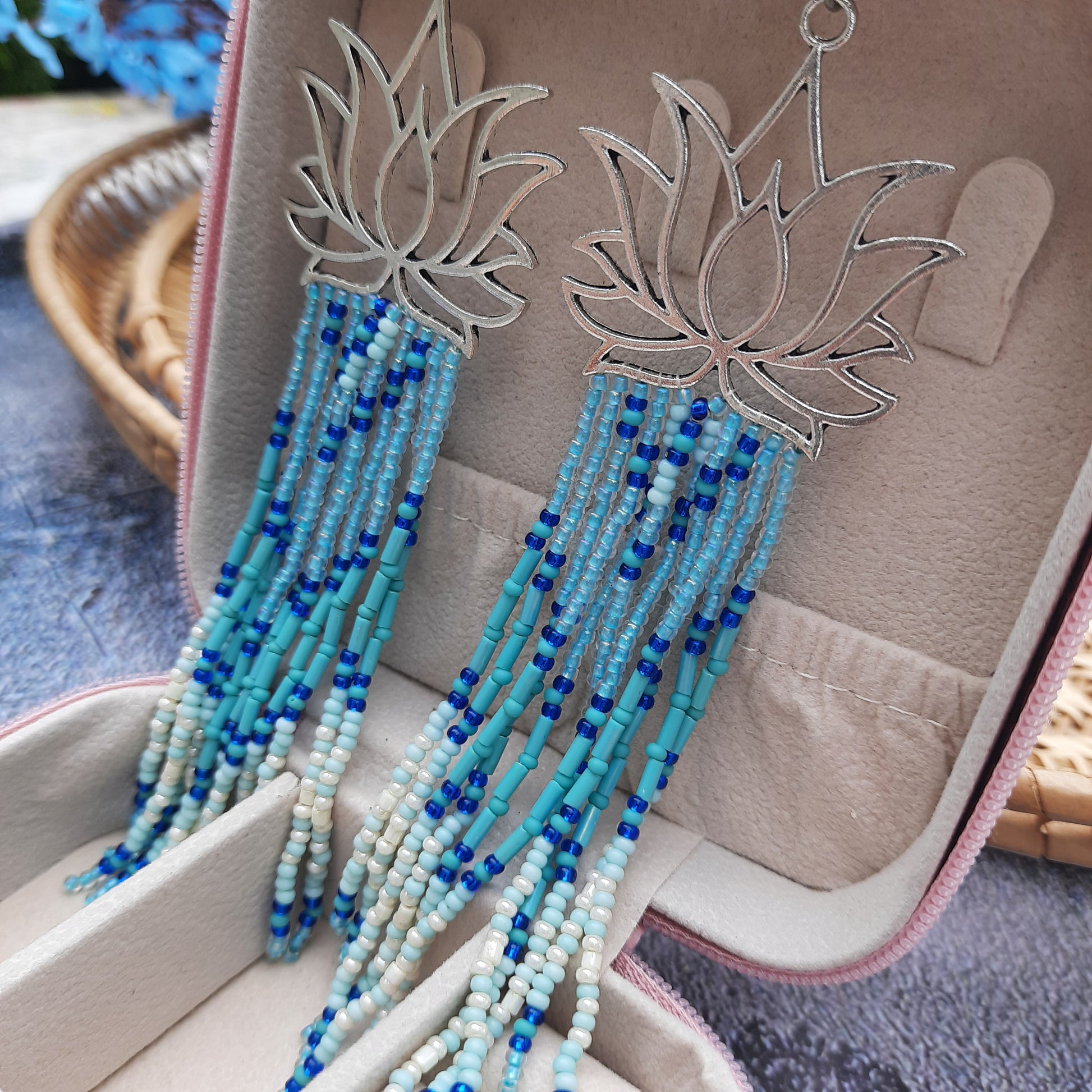 ✨ Add a touch of elegance and bohemian spirit to your look with these handmade blue lotus earrings. Featuring a delicate lotus flower charm and cascading beads in shades of blue, turquoise, and white, these earrings are a true statement piece designed to shine at any occasion.