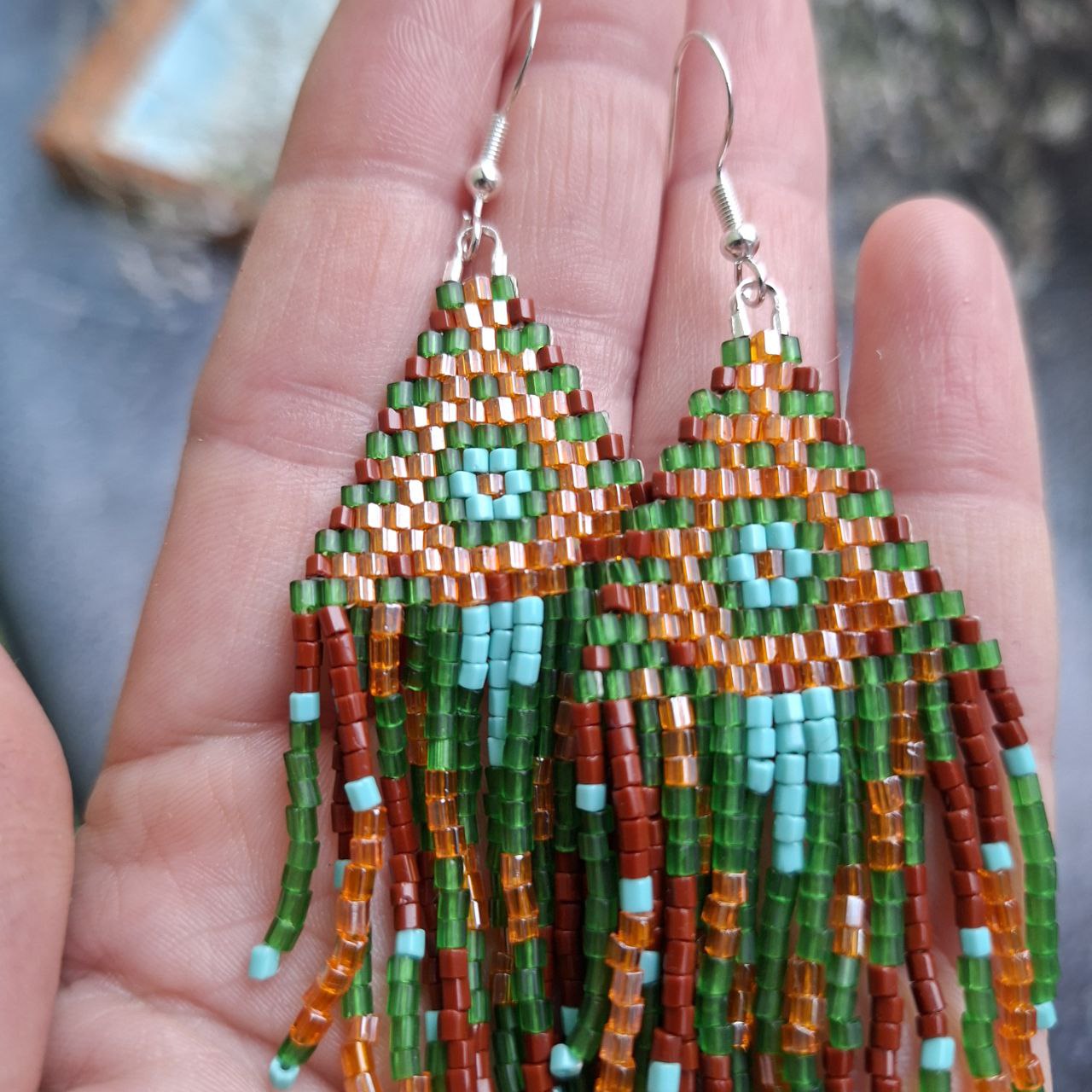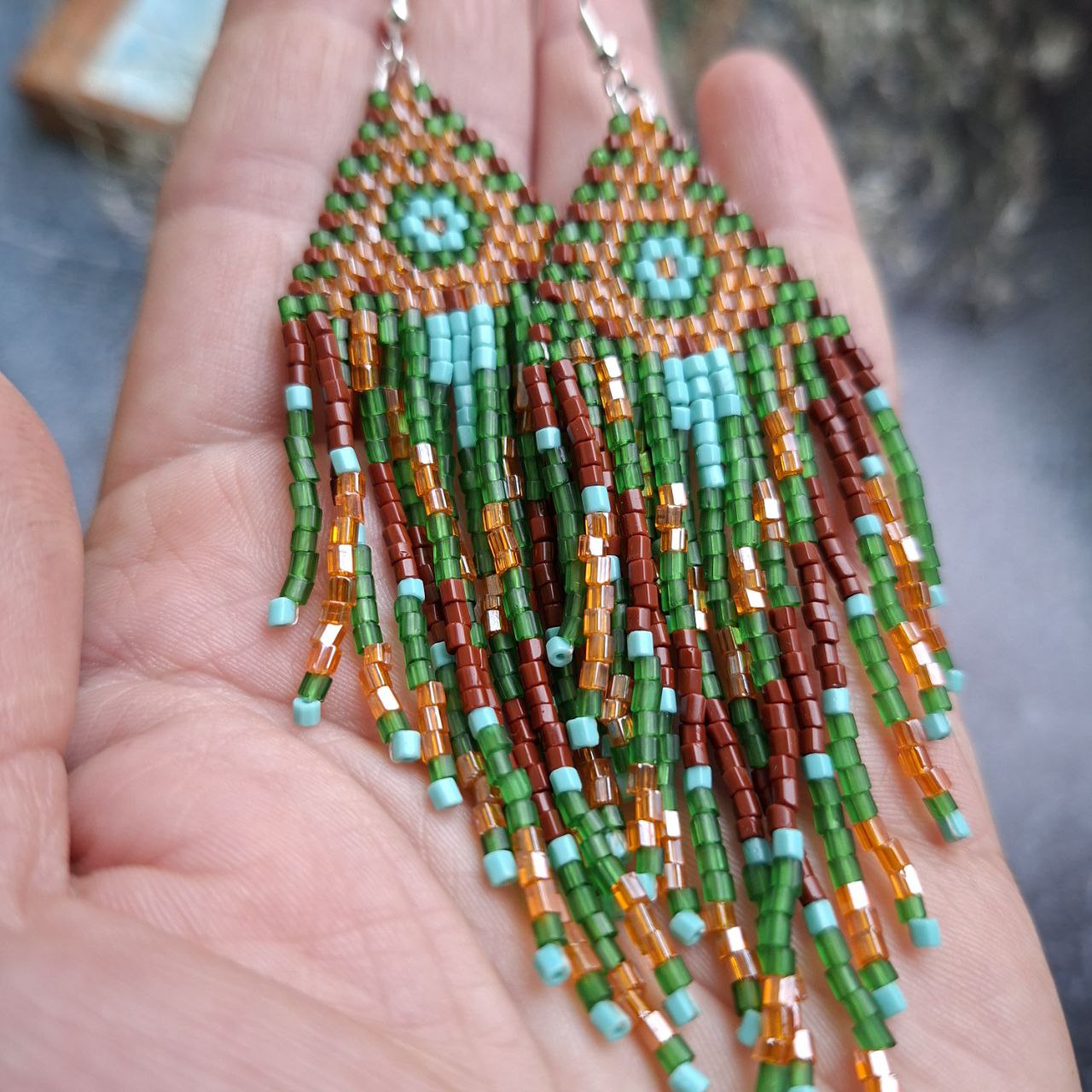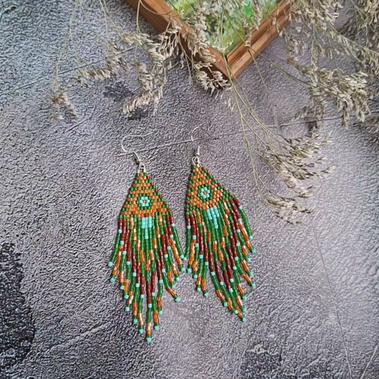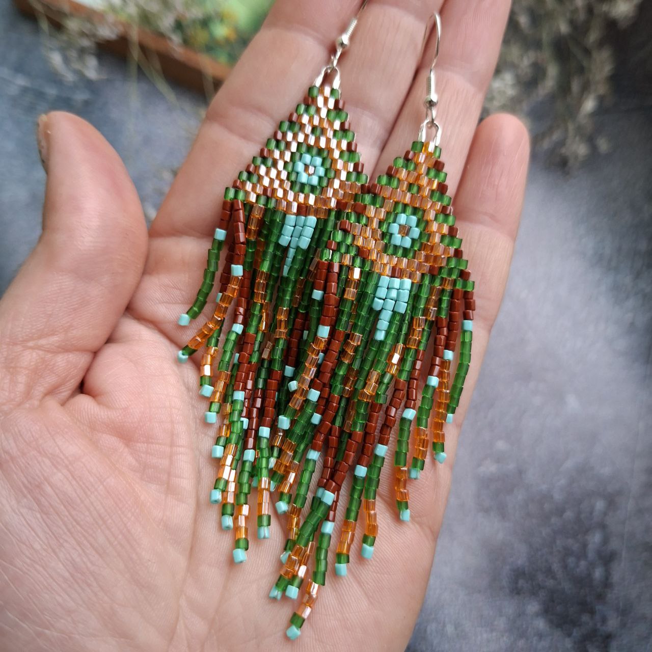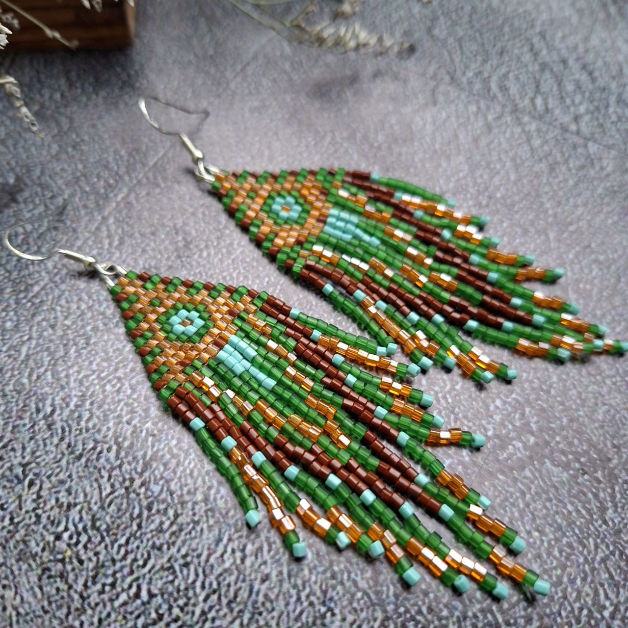 Handmade Boho Fringe Earrings – Green & Brown Seed Bead Statement Earrings