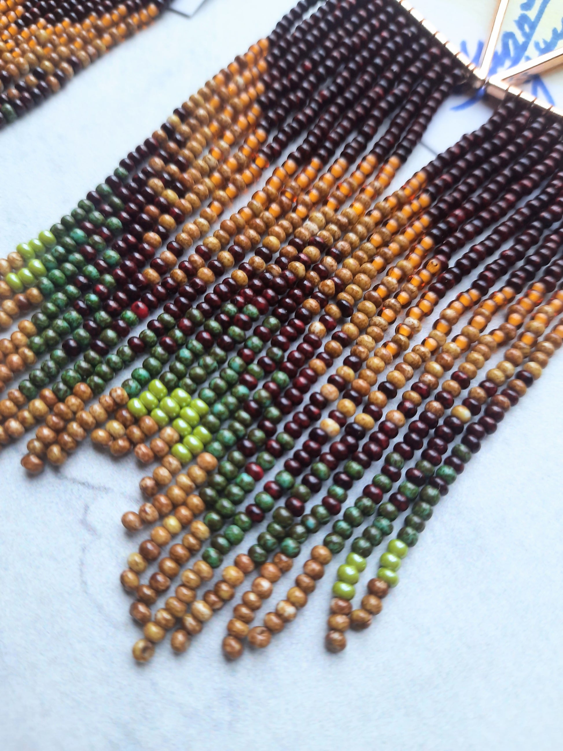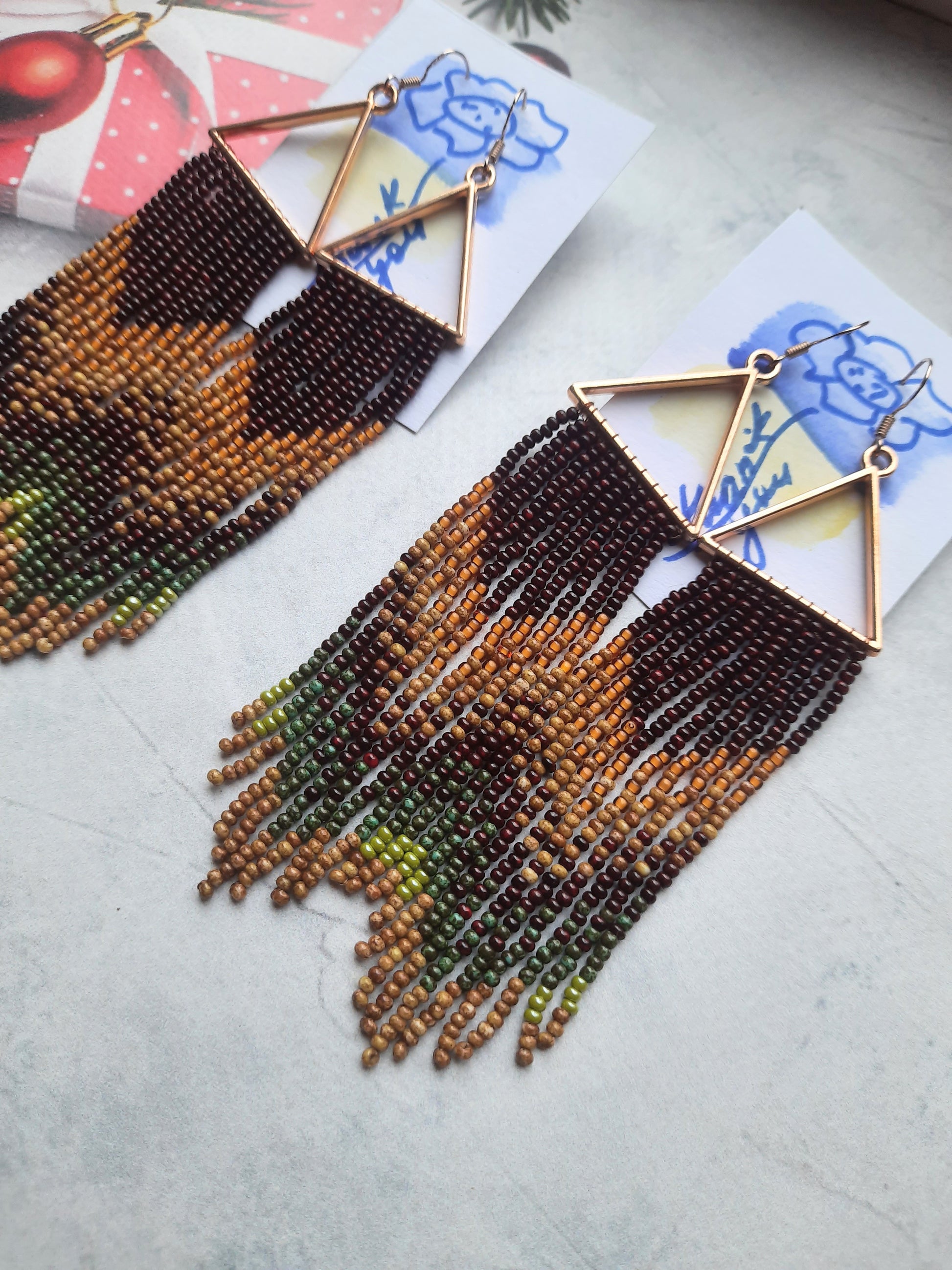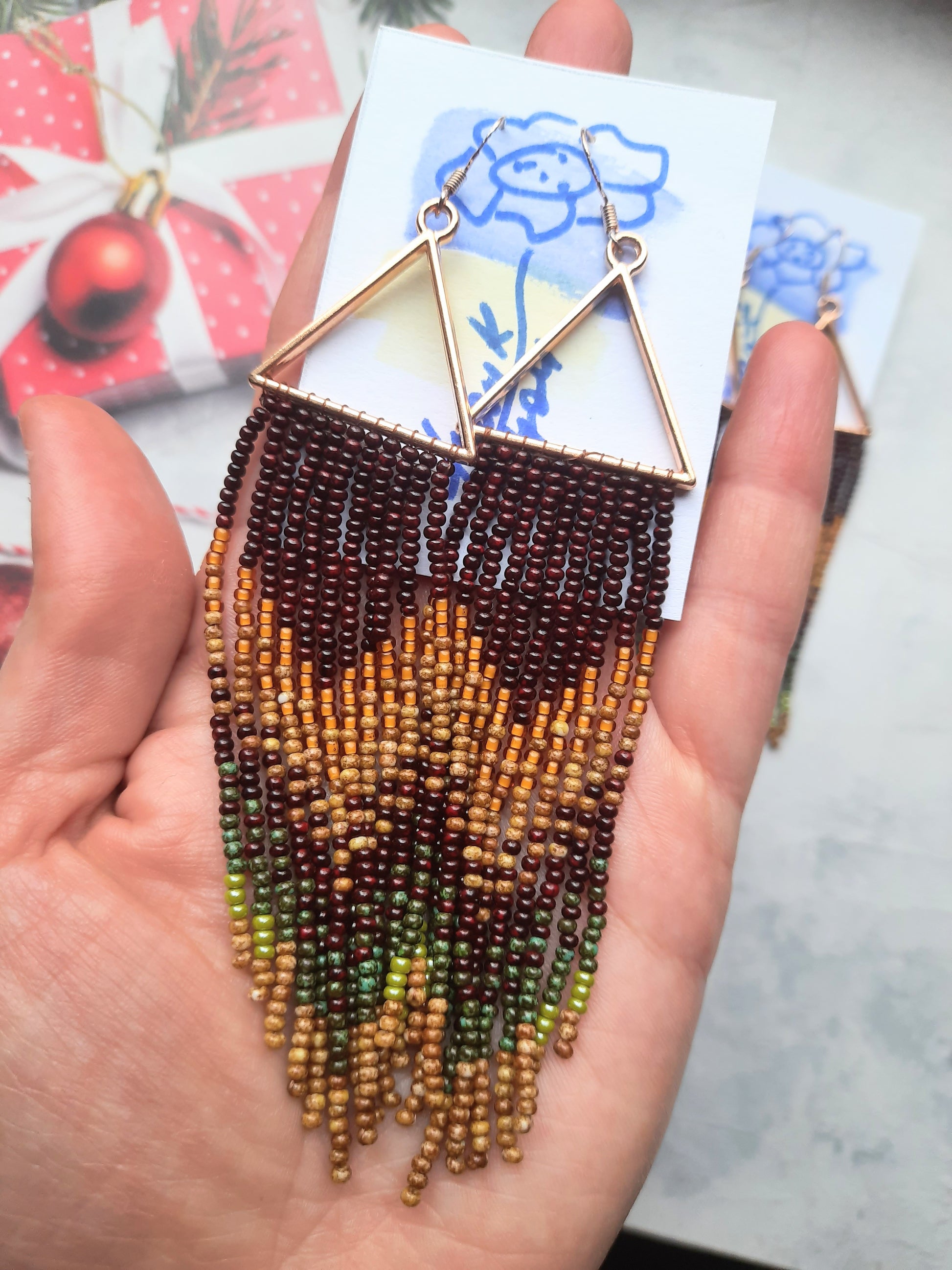 Make a bold yet natural statement with these handmade beaded fringe earrings, designed with a modern gold triangle frame and flowing seed bead fringe. The rich earth-tone palette — deep burgundy, warm gold, soft brown, and natural green — creates a beautiful ombré effect inspired by nature and boho style.