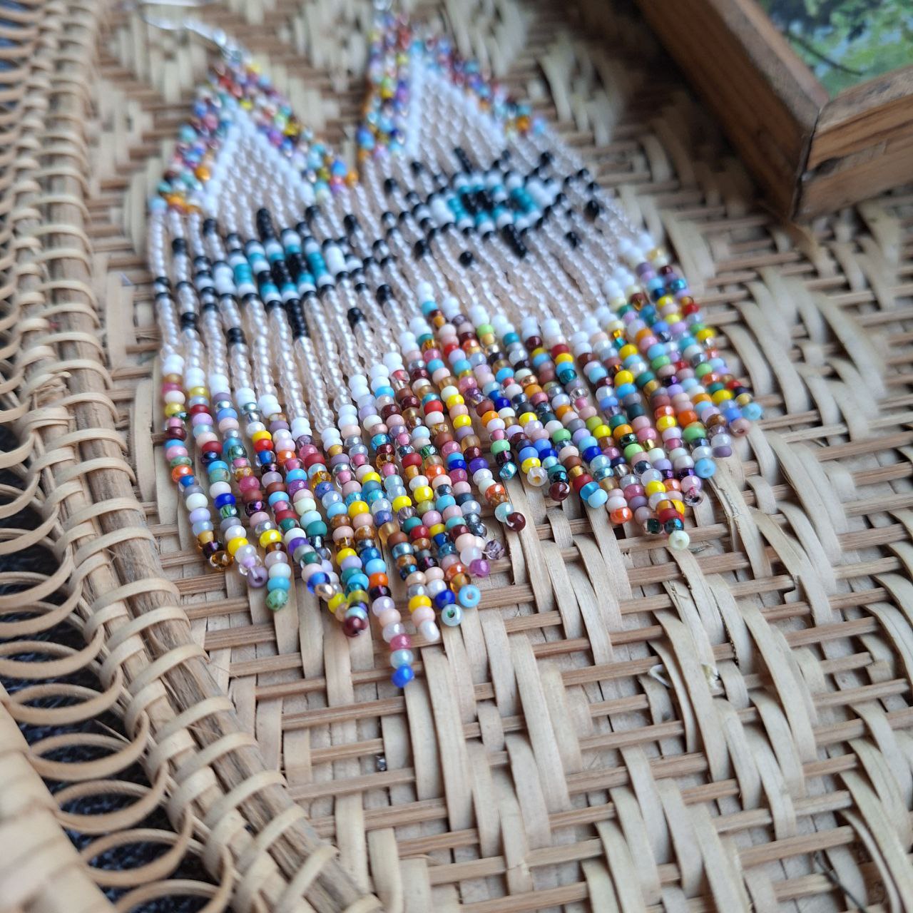 Each earring is carefully handwoven bead by bead, creating a lightweight yet dramatic fringe that moves beautifully with every step. The neutral base with pops of bright colors makes these earrings easy to style with both simple and bold outfits.