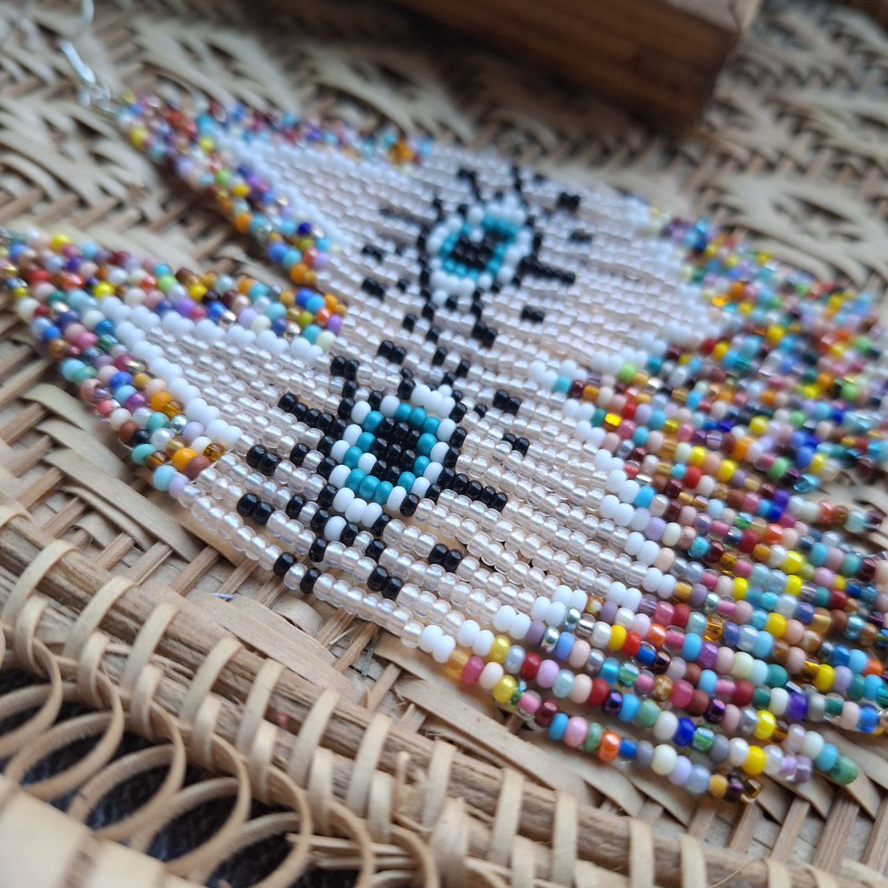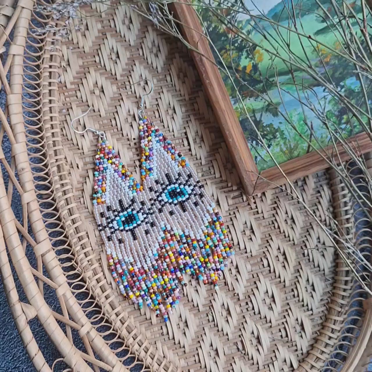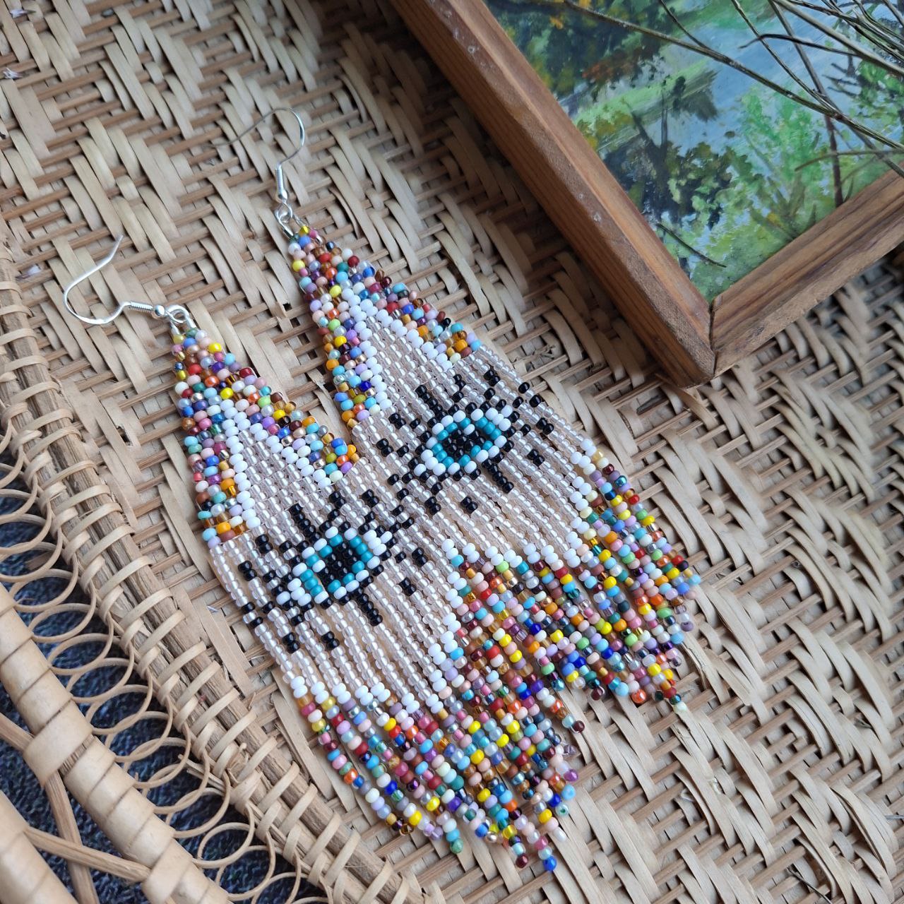 These handmade beaded fringe earrings feature a vibrant evil eye pattern surrounded by a playful mix of colorful seed beads. Designed for women who love expressive, artistic jewelry, this pair combines boho style with symbolic meaning.